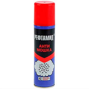 Рефтамид «Антимошка» — это репеллент, предназначенный для защиты от комаров, мошек, слепней, мокрецов и блох. Объём флакона — 145 мл. Рекомендуется использовать при температуре не ниже +10 °C.